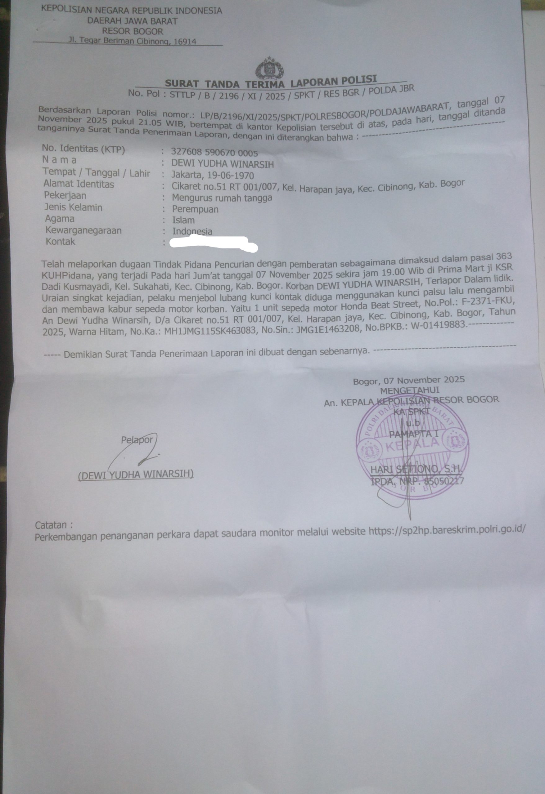 Kendaraan yang raib adalah Honda BeAT Street keluaran tahun 2025 berwarna hitam dengan striping hijau, bernomor polisi F 2371 FKU. Pemilik motor, Dewi, mengaku terkejut saat mendapati motornya sudah tidak berada di tempat parkirnya setelah selesai belanja di toko prima mart.