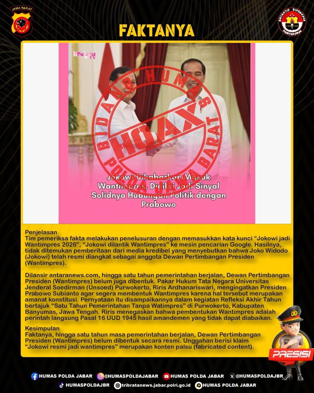 Faktanya, hingga satu tahun masa pemerintahan berjalan, Dewan Pertimbangan Presiden (Wantimpres) belum dibentuk secara resmi. Unggahan berisi klaim “Jokowi resmi jadi wantimpres” merupakan konten palsu (fabricated content).